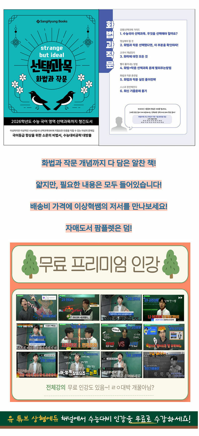 수능 국어 선택 과목 중 ‘화법과 작문’을 준비하는 수험생을 위한 맞춤형 실전 가이드북이다. 화작 선택의 유불리 분석부터 개념 정리, 문제 풀이 전략, 시간 단축법, 최신 기출분석까지 실제 수능에 필요한 요소만 골라 담았다.