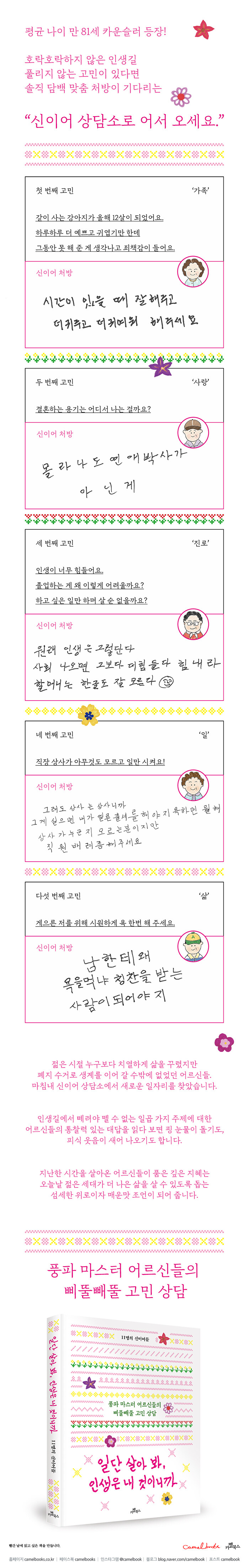 고민과 질문은 크게 일곱 가지 주제(가족, 건강, 사랑, 진로, 돈, 일, 삶)로 나누어졌습니다. 일곱 가지 주제 모두 누구나 일생에 한 번쯤 깊게 고민하고 생각하는 것이었습니다. 책에 수록된 청년들의 고민은 어르신들의 직설적이면서 솔직한, 날것 그대로의 조언으로 이어집니다. 매울 수도, 새로울 수도, 나아갈 방향일 수도 있는 어르신들의 처방이 이 책을 펼친 독자 여러분께 위로와 응원으로 가닿기를 바랍니다.