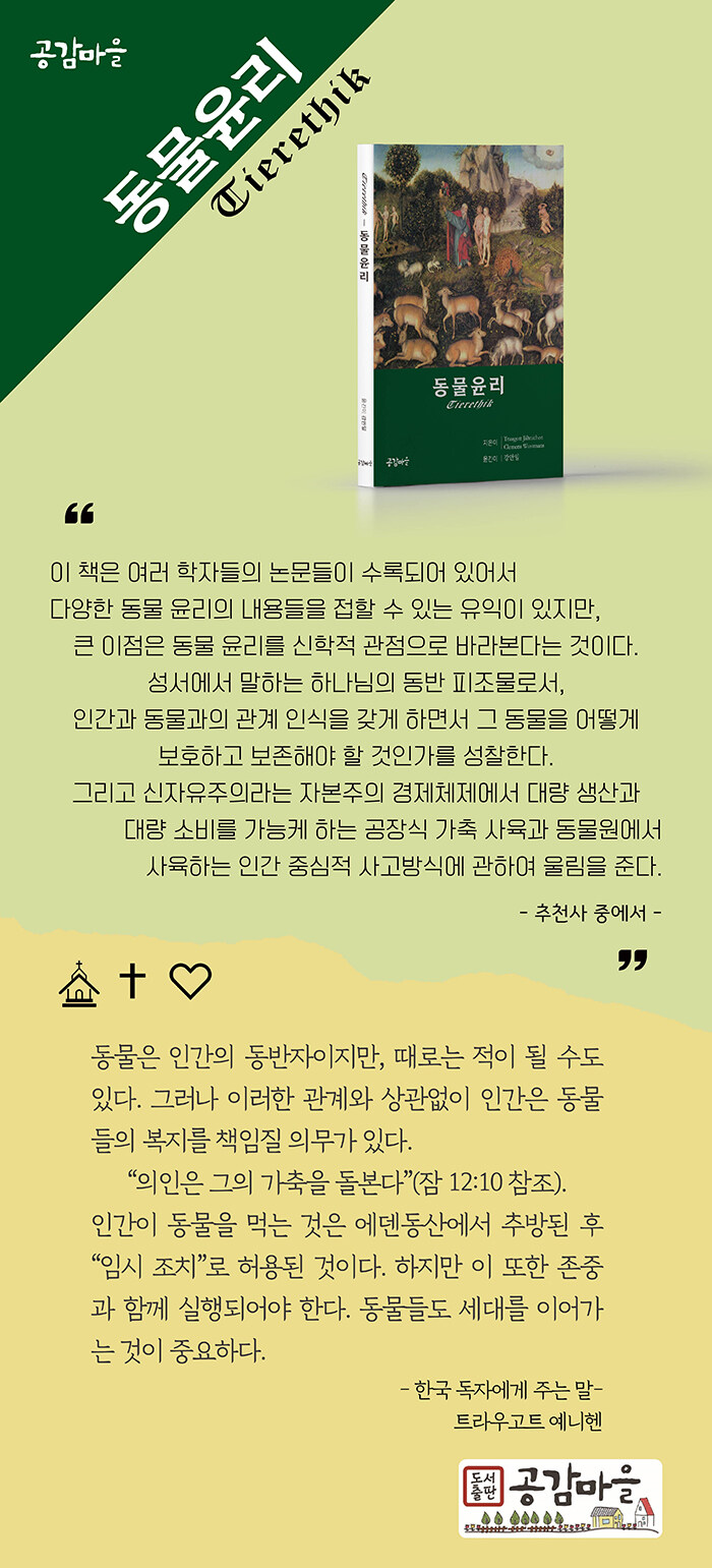 여러 학자의 논문을 통해 동물 윤리를 신학적 관점에서 재조명한다. 인간과 동물을 하나님의 동반 피조물로 인식하게 하며, 공장식 사육과 인간 중심적 사고를 비판한다. 동물 윤리를 신앙의 핵심 과제로 제시하며 실천적 성찰로 이끈다.