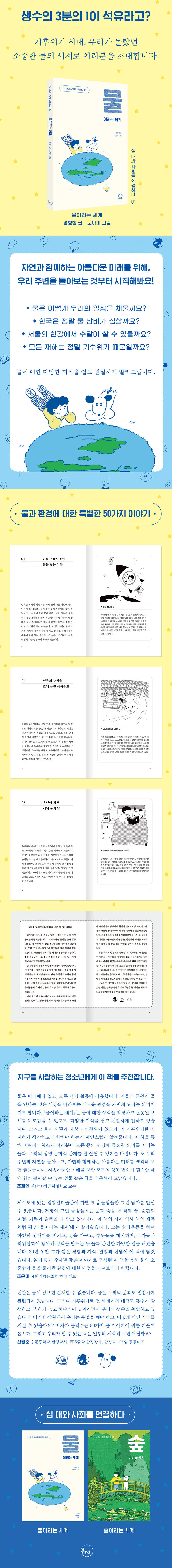 01 인류가 화성에서 물을 찾는 이유 ○ 02 지구에서 쓸 수 있는 물은 0.007퍼센트 ○ 03 깨끗한 물의 부족 ○ 04 인류의 수명을 크게 늘린 상하수도 ○ 05 유엔이 정한 세계 물의 날 ○ 06 화장실이 없는 사람들 ○ 07 한국의 일상을 채운 세계의 물 ○ 08 세계에서 발생하는 물 분쟁 ○ 09 다국적 물 기업의 탐욕과 실패 ○ 10 자연으로부터 영감을 얻는 물 관리