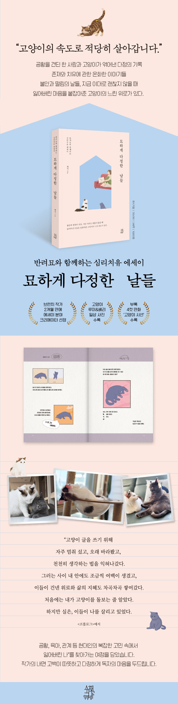 이 책은 고양이가 주는 단순한 위로를 넘어 마음 깊은 상처를 치유하고 삶의 지혜를 가르쳐주기도 한다는 점에서 여느 고양이 에세이와 결을 달리한다. 저자의 진솔하고 몰입감 있는 스토리텔링 덕분에, 바쁜 일상 속에서 고양이가 건네는 조용한 위로와 소소한 기쁨이 더 입체적으로 독자들에게 다가올 것이다.