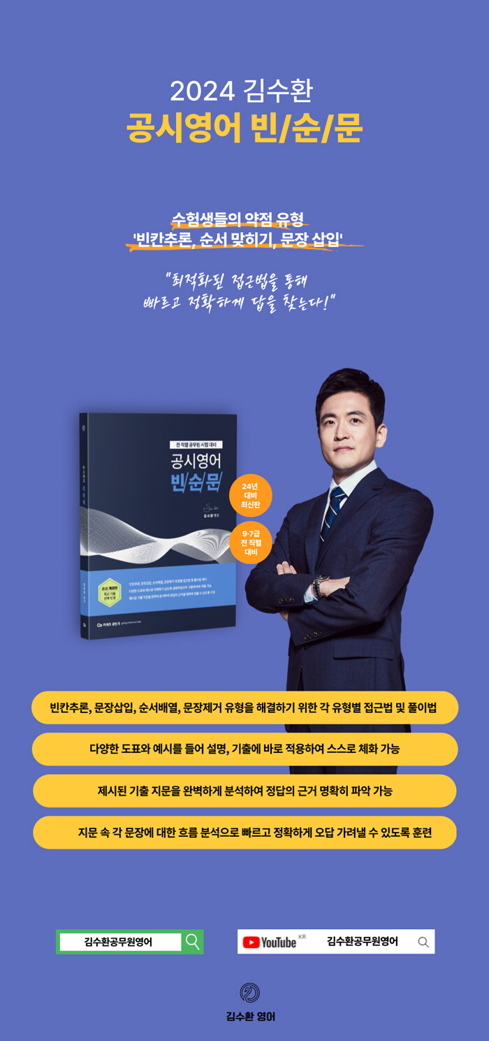 · 제목 : 2024 김수환 공시영어 빈순문 (빈칸추론, 순서배열, 문장삽입 집중 공략)