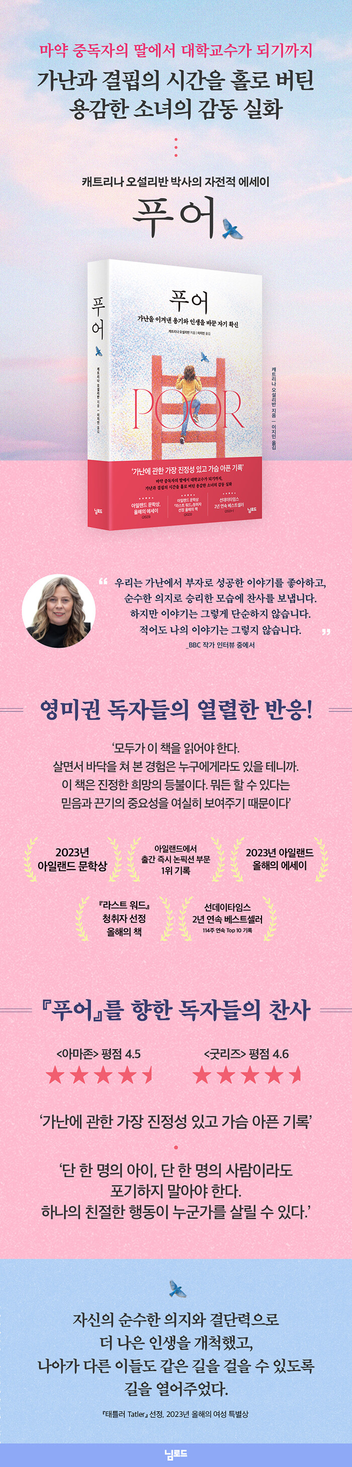 ‘모두가 이 책을 읽어야 한다. 살면서 바닥을 쳐 본 경험은 누구에게라도 있을 테니까. 이 책은 진정한 희망의 등불이다. 뭐든 할 수 있다는 믿음과 끈기의 중요성을 여실히 보여주기 때문이다’