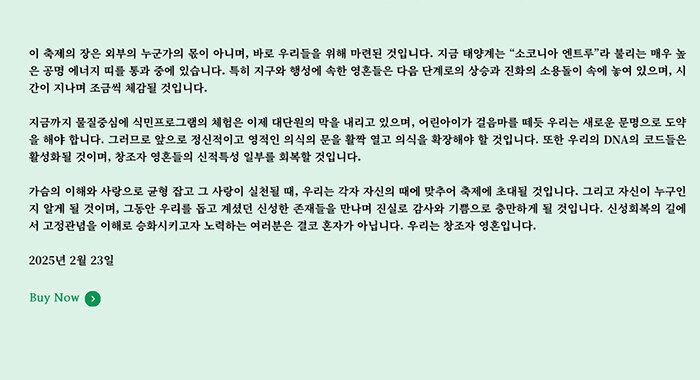 태양계는 매우 특별한 시기를 지나고 있습니다. 이 축제의 장은 외부의 누군가의 몫이 아니며, 바로 우리들을 위해 마련된 것입니다. 지금 태양계는 "소코니아 엔트루"라 불리는 매우 높은 공명 에너지 띠를 통과 중에 있습니다. 특히 지구와 행성에 속한 영혼들은 다음 단계로의 상승과 진화의 소용돌이 속에 놓여 있으며, 시간이 지나며 조금씩 체감될 것입니다.