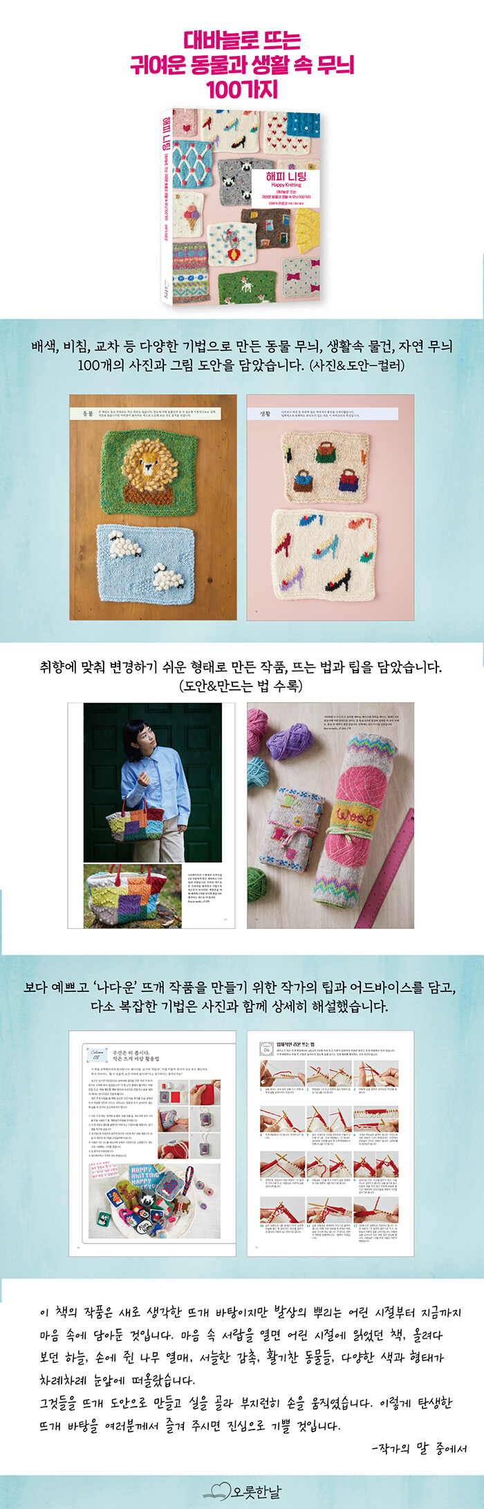 - 보다 예쁘고 ‘나다운’ 뜨개 작품을 만들기 위한 작가의 팁과 어드바이스를 담고, 다소 복잡한 기법은 사진과 함께 상세히 해설했습니다.