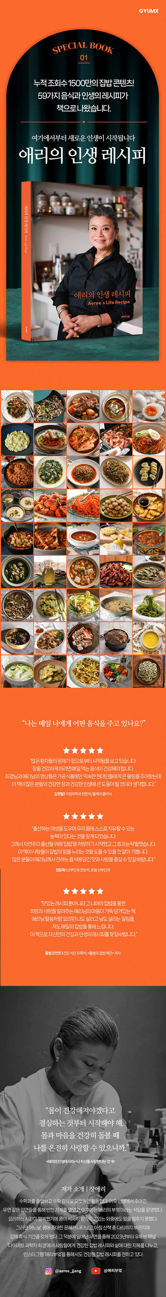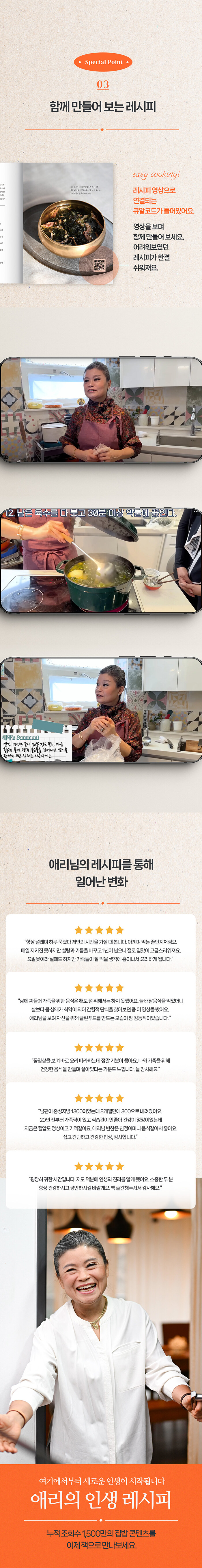 이 책은 그녀가 걸어온 삶의 여정을 솔직하게 고백하며, 그 과정에서 얻은 깨달음과 지혜, 그리고 그것을 가능하게 한 건강한 집밥 레시피를 담고 있다. 이 책은 단순한 요리책이 아니다. 한 여성이 살아오며 경험하고 배운 것들이, 또 다른 누군가가 스스로를 소중히 돌보고 건강한 삶을 살아갈 수 있도록 전해지는 지혜의 기록이다.