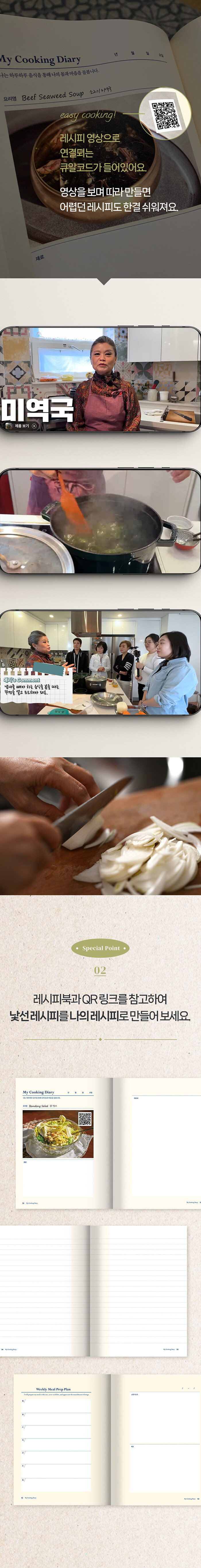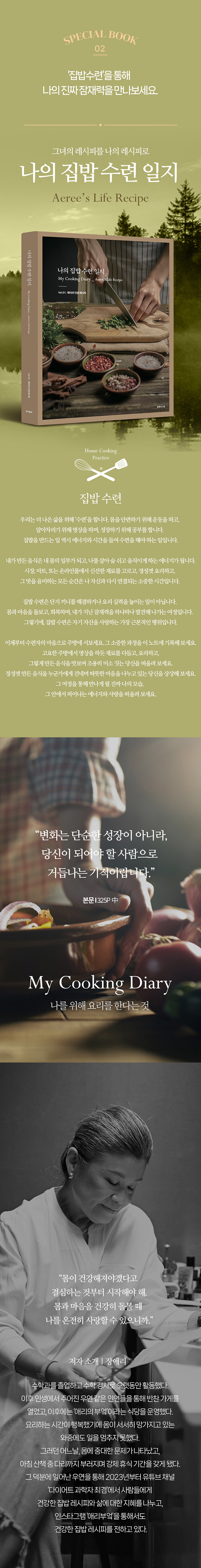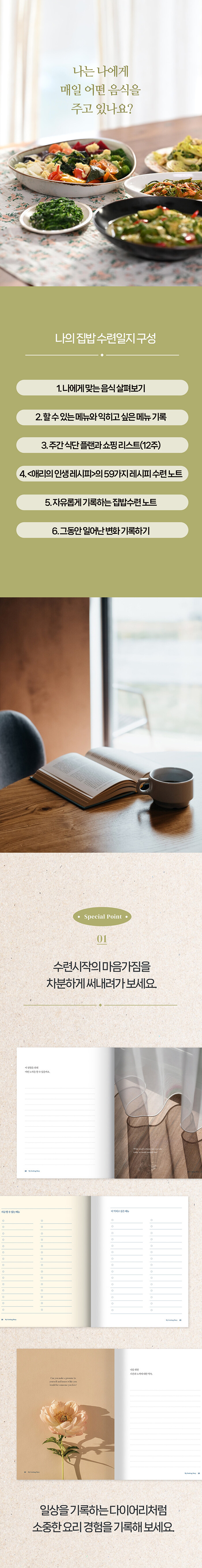 오랜 시간 요리를 사랑했던 여성 장애리의 레시피북 “애리의 인생 레시피”를 보고 직접 요리하며 기록하는 요리 일지다. 각 메뉴의 재료와 만드는 법을 적는 공간이 있고, 그 뒤에는 요리하면서 배우거나 느낀 것, 또는 기록하고 싶은 것들을 적는 여백이 1장씩 포함되어 있다.