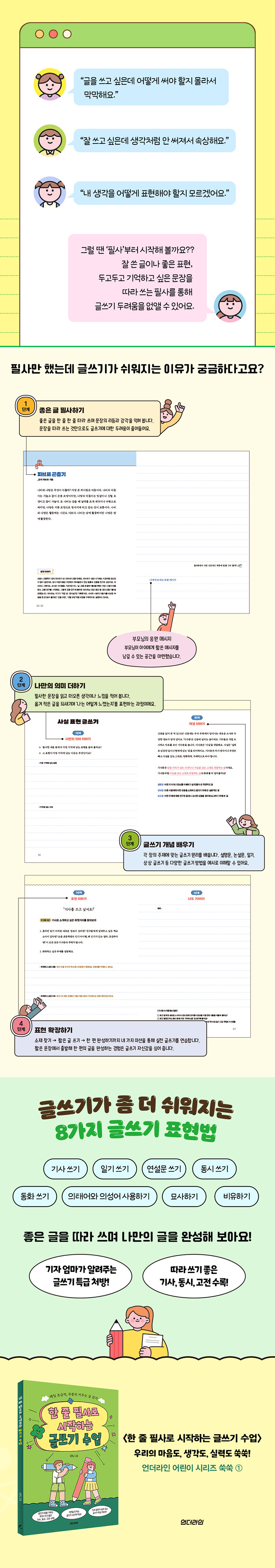 글 한 편을 완성할 수 있을 거예요. 내가 쓴 글이 마음에 쏙 들지 않을 수도 있어요. 하지만 기억하세요! 나의 이야기는 나만 쓸 수 있다! 매일 조금씩 꾸준히 쓰다 보면 잘 쓸 수 있다!