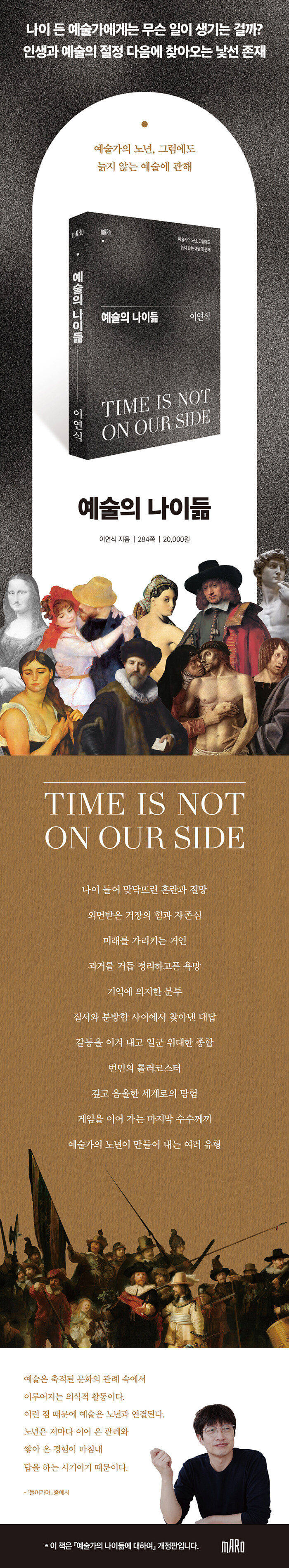 유년의 궁금증에 답을 해 주는 이는 중년이 된 저자다. 그는 노년이 되면 온후하고 보수적인 입장을 취할 거라고 여기기 쉽지만 예술가들은 오히려 곧잘 궤도에서 이탈했고, 그 양상도 매우 흥미롭다고 말한다. 『예술의 나이듦』에 등장하는 예술가들이 잘 보여 준다. 이들의 행보는 자신의 예술뿐 아니라 인생 전반에, 무엇보다 이를 지켜보는 우리에게 인생의 이정표를 제시한다. 이 책을 두 번, 세 번 탐독하게 되는 이유다.
