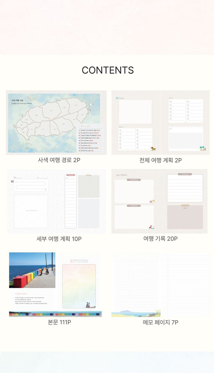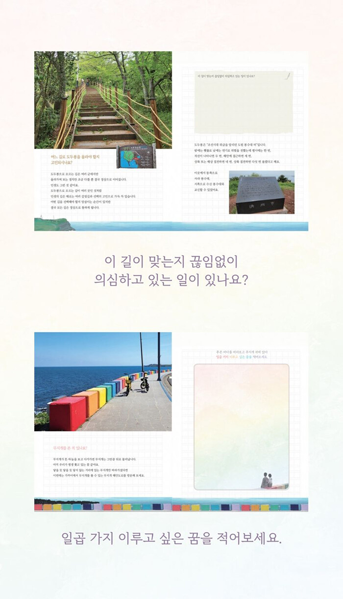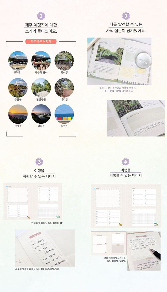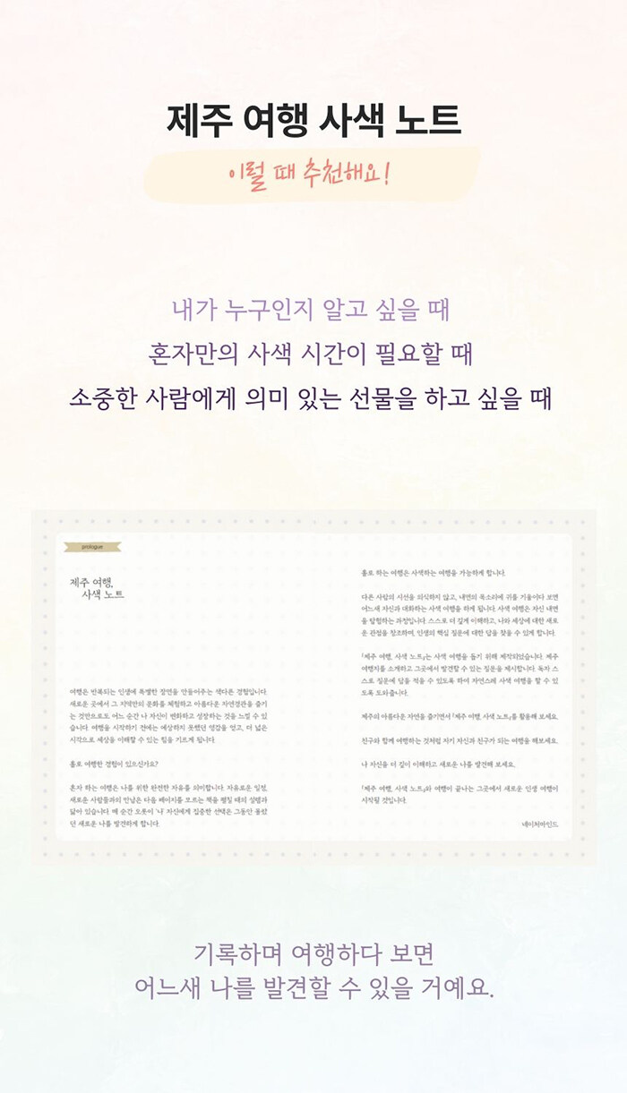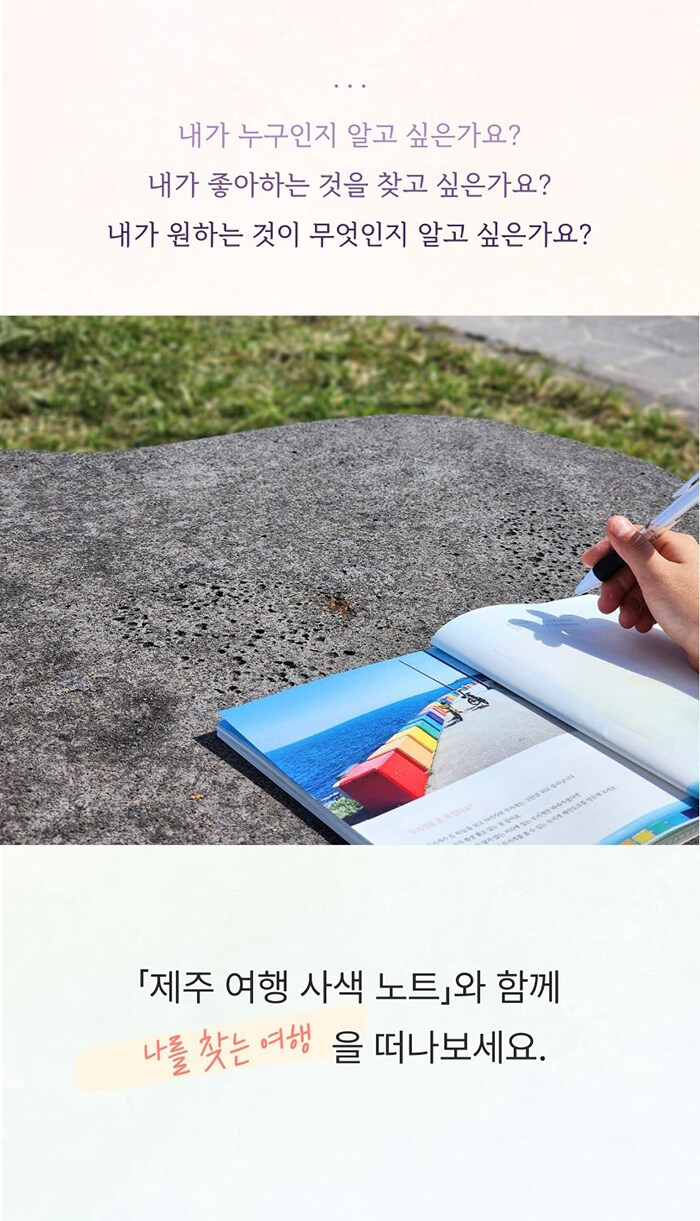 제주 주요 여행지 관덕정, 제주목 관아, 향사당, 수월봉, 한림공원, 비자림, 사라봉, 별도봉, 도두봉을 여행하며 써 내려가는 사색 노트이다. 홀로 여행하며 사색 여행을 즐기는 사람들을 돕기 위해 제작된 <제주 여행 사색 노트>는 제주 여행지를 소개하고 그곳에서 발견할 수 있는 질문을 제시한다.