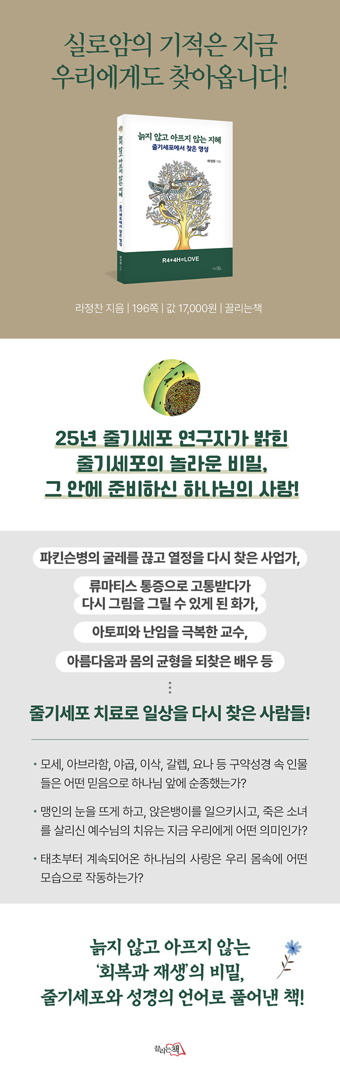 나는 줄기세포를 연구하면서 이 사실을 점점 분명히 보게 되었다. 몸과 영혼은 따로 늙지 않는다. 함께 늙고 함께 회복된다. 어떻게 하면 야곱처럼 긴 병상에 묶이지 않고 삶을 정리할 수 있을까? 어떻게 하면 이삭처럼 온유함 속에서 평안히 인생을 마칠 수 있을까? 이 책은 기적을 약속하지 않는다. 완치를 선언하지도 않는다. 다만 묻고 싶다. 늙음을 당연하게 받아들이기 전에, 아픔을 운명으로 체념하기 전에, 우리는 다시 선택할 수 있지 않겠는가.