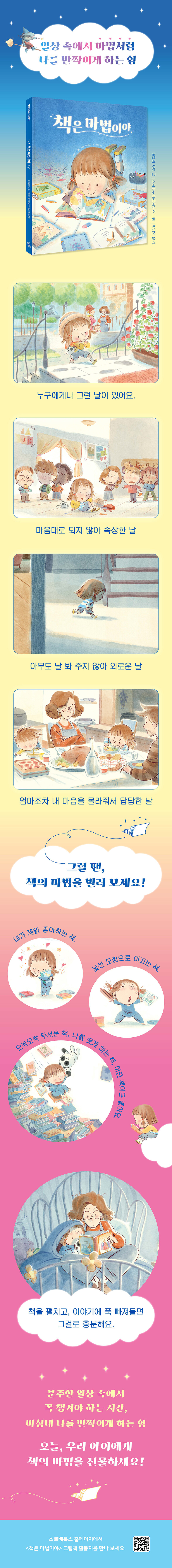 책의 마법에 대해 들어 본 적 있는가? 책을 읽고 난 뒤에 벌어지는 놀랍고도 신기한 경험. 방법은 아주 간단하다. 마음이 끌리는 책을 골라 펼치고, 이야기에 푹 빠져들기만 하면 되니까. 책은 분주한 마음을 차분하게 만든다. 속상한 마음을 위로하고, 울고 싶은 마음을 다독여 준다. 온종일 일이 꼬여 시무룩한 아이에게 엄마는 책이 가진 마법 같은 힘에 대해 알려 준다. 그리고 아이와 함께 책을 읽기 시작하는데…. 신기하게도 모든 것이 엉망진창이라고 생각했던 오늘 하루가 책을 읽고 난 뒤 한결 다르게 보이기 시작한다. 롤러코스터처럼 좋고 싫은 감정이 오르락내리락하는 우리 아이들의 하루도 그림책 속 아이의 하루와 크게 다르지 않을 것이다. ‘우리 곁에 책이 있어야 하는 이유’와 ‘책과 함께라면 언제나 괜찮을 것’이라는 책의 마법이 이 그림책을 읽는 모든 아이들에게 전해지길 기대한다.