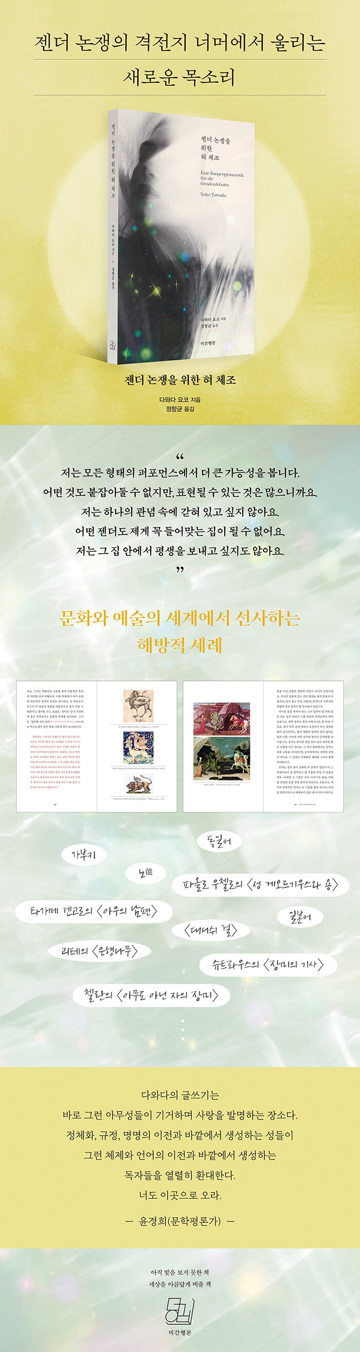 낯선 언어와 세공된 기호로 환각에 가까운 문학 세계를 펼쳐 보인 샤먼, 경계를 넘나드는 독보적인 글쓰기로 변신의 미학을 설파한 작가, 다와다 요코의 『젠더 논쟁을 위한 혀 체조』가 문학 출판사 미간행본의 첫 책으로 출간되었다.