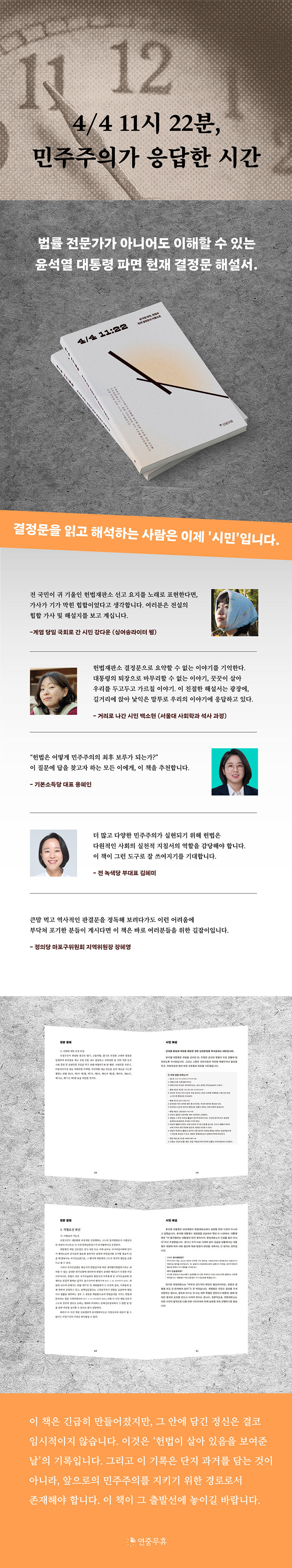 2025년 4월 4일 오전 11시 22분, 대한민국 제20대 대통령 윤석열이 파면되었다. 《4/4 11:22》은 윤석열 대통령 탄핵 사건 헌법재판소 결정문을 처음 읽는 사람도 쉽게 이해할 수 있도록 풀어낸 책이다.