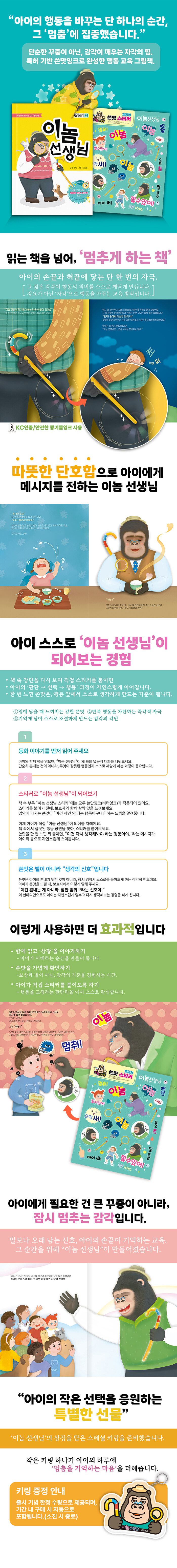말보다 경험이 먼저인 훈육을 제안한다. 쓴맛 잉크를 활용해 아이가 스스로 행동을 멈추고 생각하도록 돕는 감각 교육 동화로, 꾸짖음 대신 감각 경험을 통해 자기조절력을 익히는 과정을 담았다. 식물성 원료의 쓴맛 잉크를 사용했고 KC 인증으로 안전성을 검증했다.