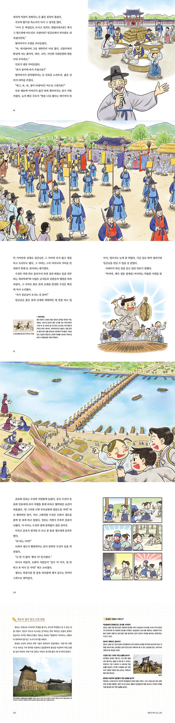 이 책은 효자 임금 정조의 수원 화성 행차를 다룹니다. 조선 왕조를 통틀어 가장 장엄하고 화려한 행사로 꼽히는 이 행차를 통해 정조는 억울하게 죽은 아버지 사도세자의 명예를 되찾고, 백성들과 반대 세력에게 위험을 보입니다. 또 행차에 구경 나온 백성들을 직접 만나 억울함을 풀어 주기도 하지요. 거대한 행렬이 배다리를 지나 한강을 건너는 장면에서는 정조 시대의 발달된 과학 기술을 엿볼 수 있습니다. 부록 ‘준호의 역사 노트’에서는 정조가 지은 수원 화성 이야기와 화성 행차의 의미, 조선 후기를 꽃피운 정조 시대를 《화성성역의궤》 《일성록》 등의 기록물과 함께 살펴봅니다. 도화서 화원들이 그린 8폭의 〈화성능행도병〉 전체가 실려 있어 화성 행차의 면면을 세밀하게 볼 수 있습니다.