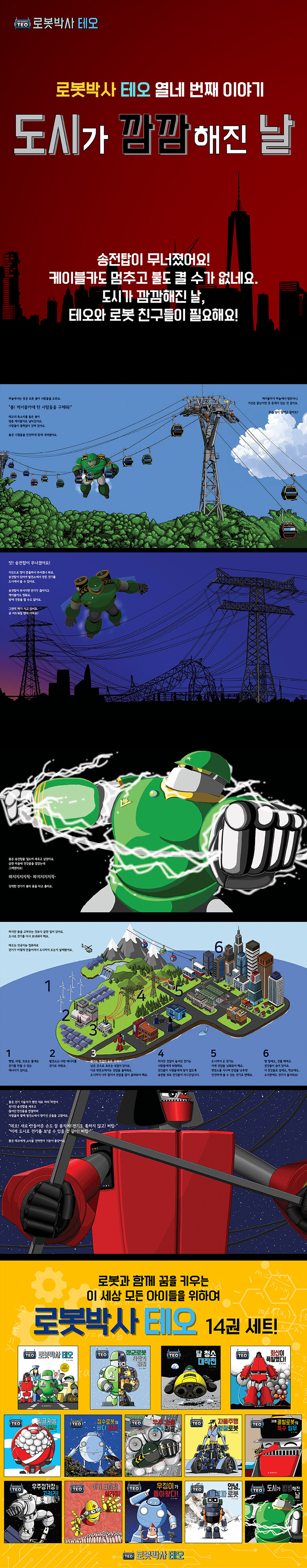 <로봇박사 테오> 시리즈의 열 네번째 이야기, <도시가 깜깜해진 날>은 갑작스러운 정전으로 온 도시가 어둠에 잠기면서 시작되는 긴장감 넘치는 이야기입니다. 무너진 송전탑 때문에 도시의 전기가 모두 끊기고, 트램과 케이블카가 멈추는 위기 속에서 로봇 친구들이 도시를 구하기 위해 나섭니다.