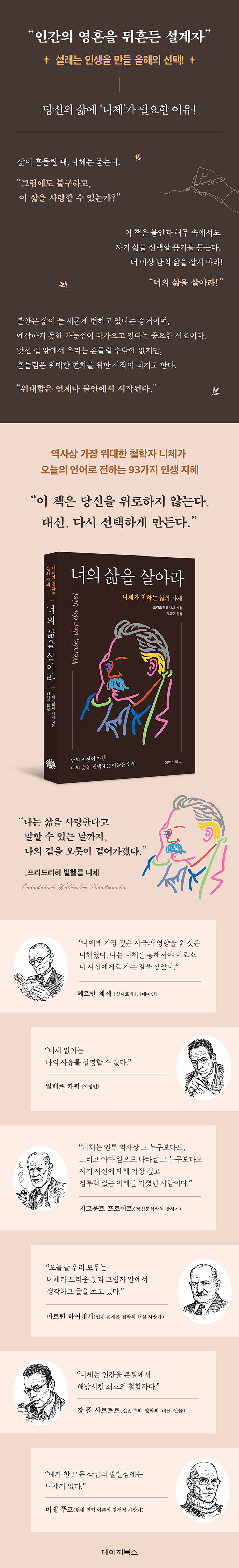 『너의 삶을 살아라』는 니체의 방대한 철학을 설명하는 책이 아니다. 대신 인간관계, 일, 감정, 선택의 순간마다 우리가 스스로에게 던져야 할 질문들을 실천의 언어로 풀어낸다. 실패는 끝이 아니라 새로운 의미의 시작이며, 불안은 잘못 살고 있다는 증거가 아니라 삶이 새롭게 움직이기 시작했다는 증거임을 일깨운다.