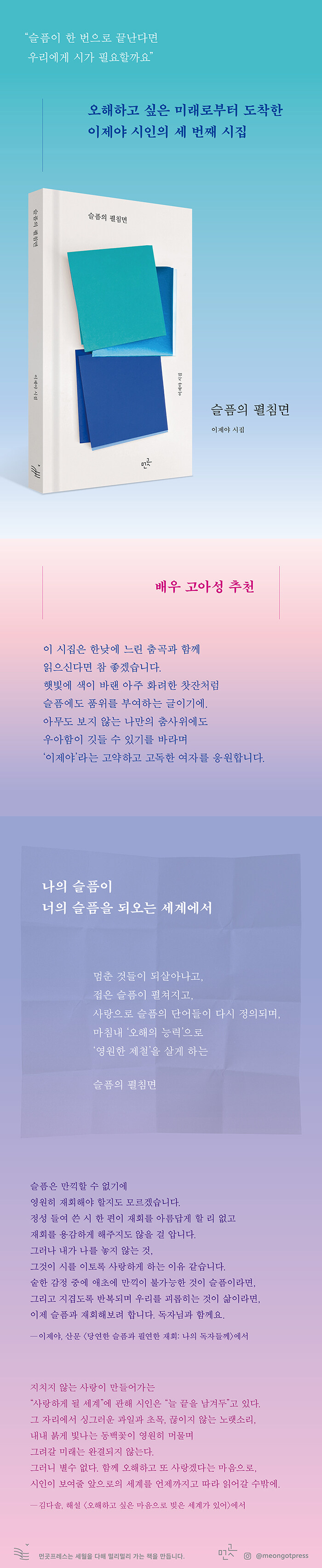 이제야 시인은 세 번째 시집에 이르러 우리의 오랜 슬픔을 탐구한다. 《슬픔의 펼침면》에 실린 50편의 시들은 “슬픔을 펼친 면”(이상, 〈시소와 나〉)에서 시작해 “아무것도 아닌 것들” “밀어내던 것들” “무심한 말들”을 경유하여 “성실하게 접어둔 곳들” “정성껏 접어둔 곳들”(이상, 〈의도 없는 날〉)에 다다른다. “나의 슬픔이 너의 슬픔을 되오는 세계”(〈시인의 말〉)는 곧 우리가 “사랑하게 될 세계”(〈문장완성검사〉)로 완성된다.