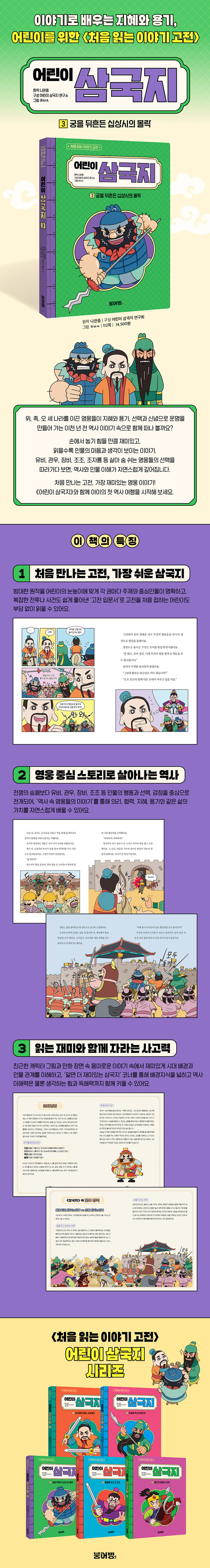 또한 ‘알면 더 재미있는 삼국지’ 코너를 통해 등장인물, 병법, 전투 방식, 지역 정보 등을 쉽게 풀어 설명해, 이야기의 재미를 넘어 역사적 배경지식과 이해를 자연스럽게 넓혀 줍니다. 친근한 캐릭터 스타일의 그림과 만화 형식의 장면은 글과 그림이 유기적으로 어우러진 높은 몰입감을 선사합니다.