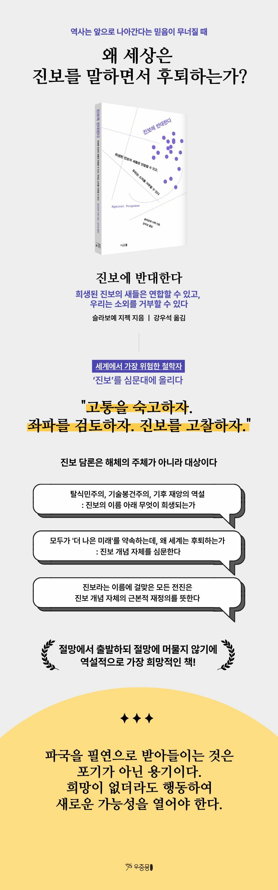 슬라보예 지젝은 이 역설의 한가운데로 걸어 들어간다. 『진보에 반대한다』는 '진보'라는 단어를 심문대에 올려놓는다. 누가 이 단어를 점령했는가. 그들이 말하는 '더 나은 미래'에서 무엇이 배제되고, 무엇이 희생되는가. 13편의 에세이를 통해 지젝은 우리 시대 가장 불편한 질문을 던진다.