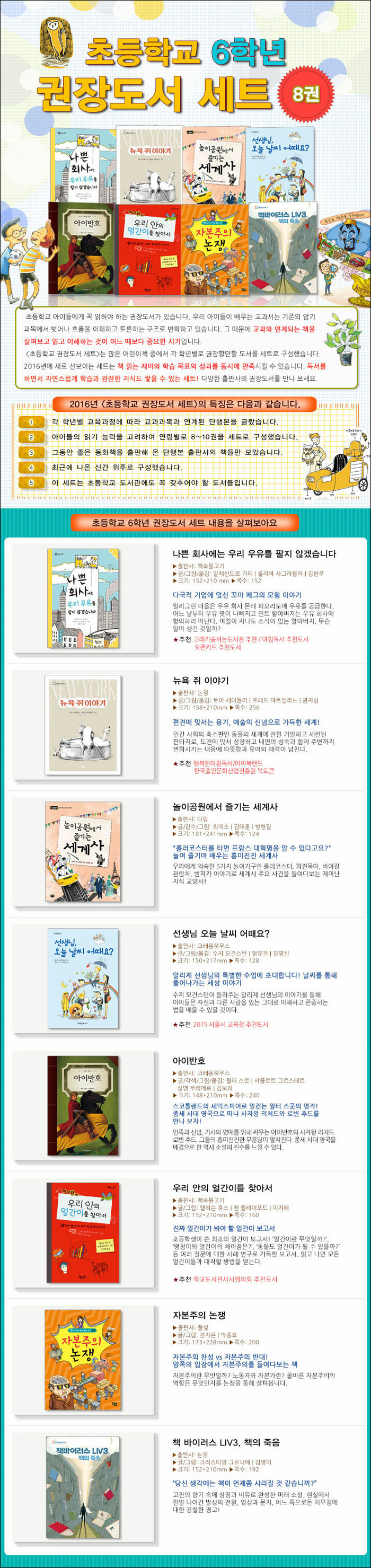 초등학교 권장도서 세트. 많은 어린이책 중에서 각 학년별로 권장할만한 도서를 세트로 구성했다. 2016년에 새로 선보이는 세트는 책 읽는 재미와 학습 목표의 성과를 동시에 만족시킬 수 있다. 독서를 하면서 자연스럽게 학습과 관련된 지식도 쌓을 수 있는 세트이다.